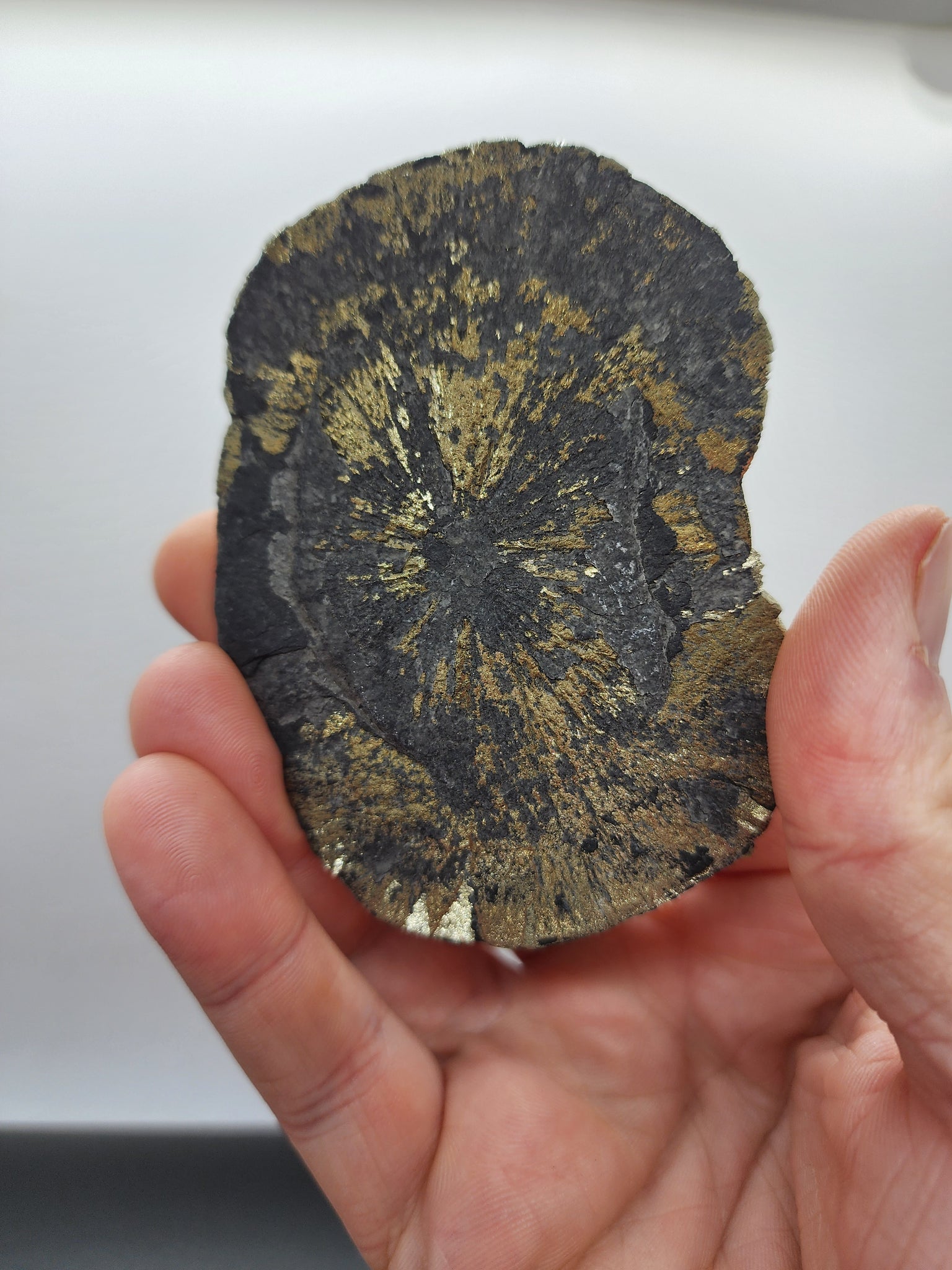Pyrite, or "fool's gold," catches your eye with its metallic luster and brassy hue, looking like scattered coins or rough-hewn nuggets against the gray matrix of the host rock. While its color is a bold, pale gold, the mineral reveals its true identity through its sharp, cubic formations—some edges clean and defined, others slightly worn—and its subtle greenish or black streak when dragged across a surface. Holding it, you feel its surprising weight, a density that grounds the shimmering exterior, while a close look shows off its opaque, mirror-like faces that reflect the surrounding earth in miniature. These distinctive specimens are found specifically near Sparta, Illinois, where they form as flat, disc-shaped concretions known as "pyrite suns" or "mineral dollars," nestled between layers of compacted shale and coal in the region's geological formations.