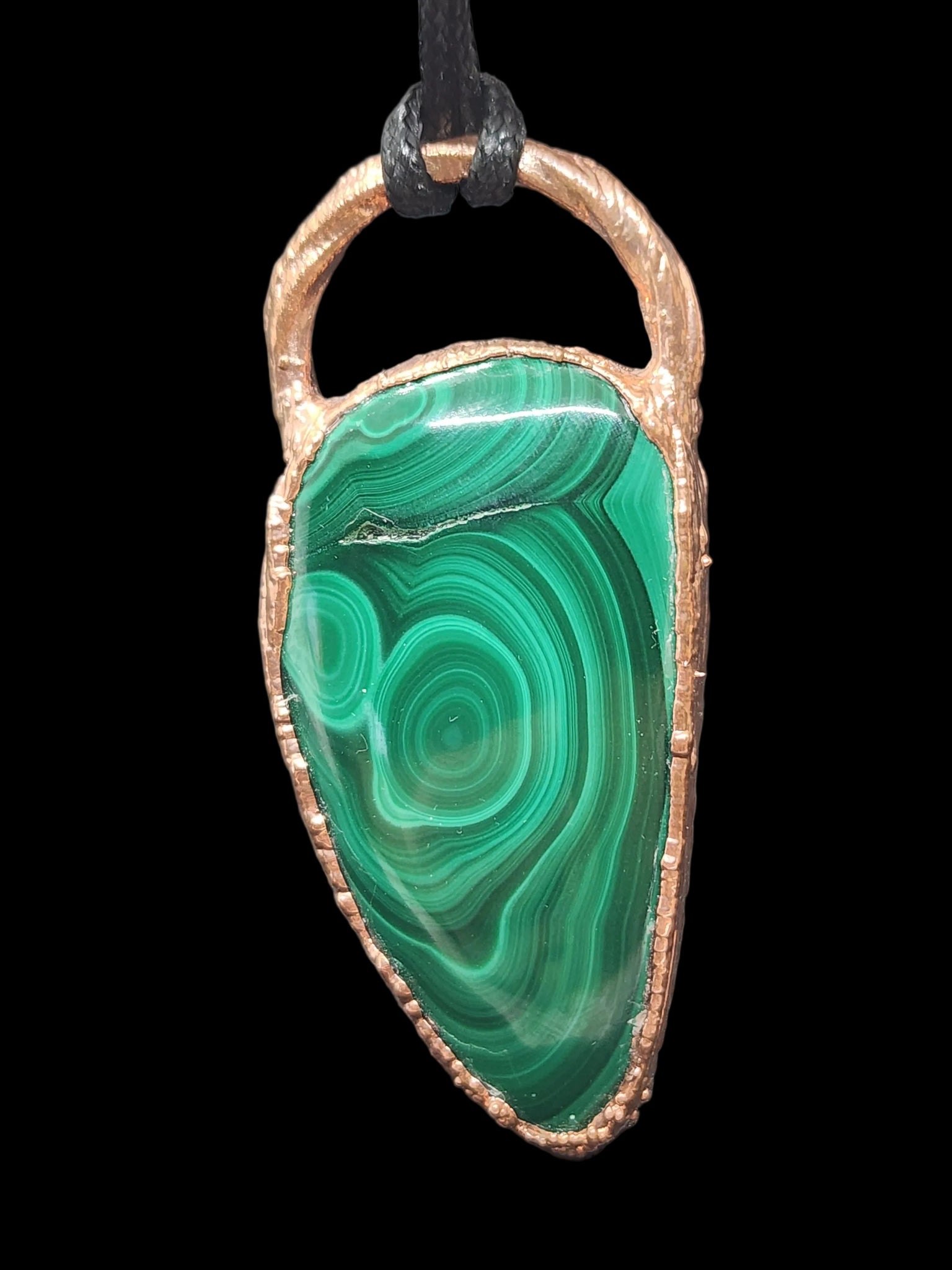 I hand-set this captivating stone using the art of electroforming, allowing the copper to grow organically around its smooth dome. The warm, earthy copper mirrors the rich greens of the malachite, creating a harmonious blend of metal and mineral that feels as if it was pulled directly from the earth. The result is a bold, grounding statement piece that carries the timeless beauty of nature's own geometry.