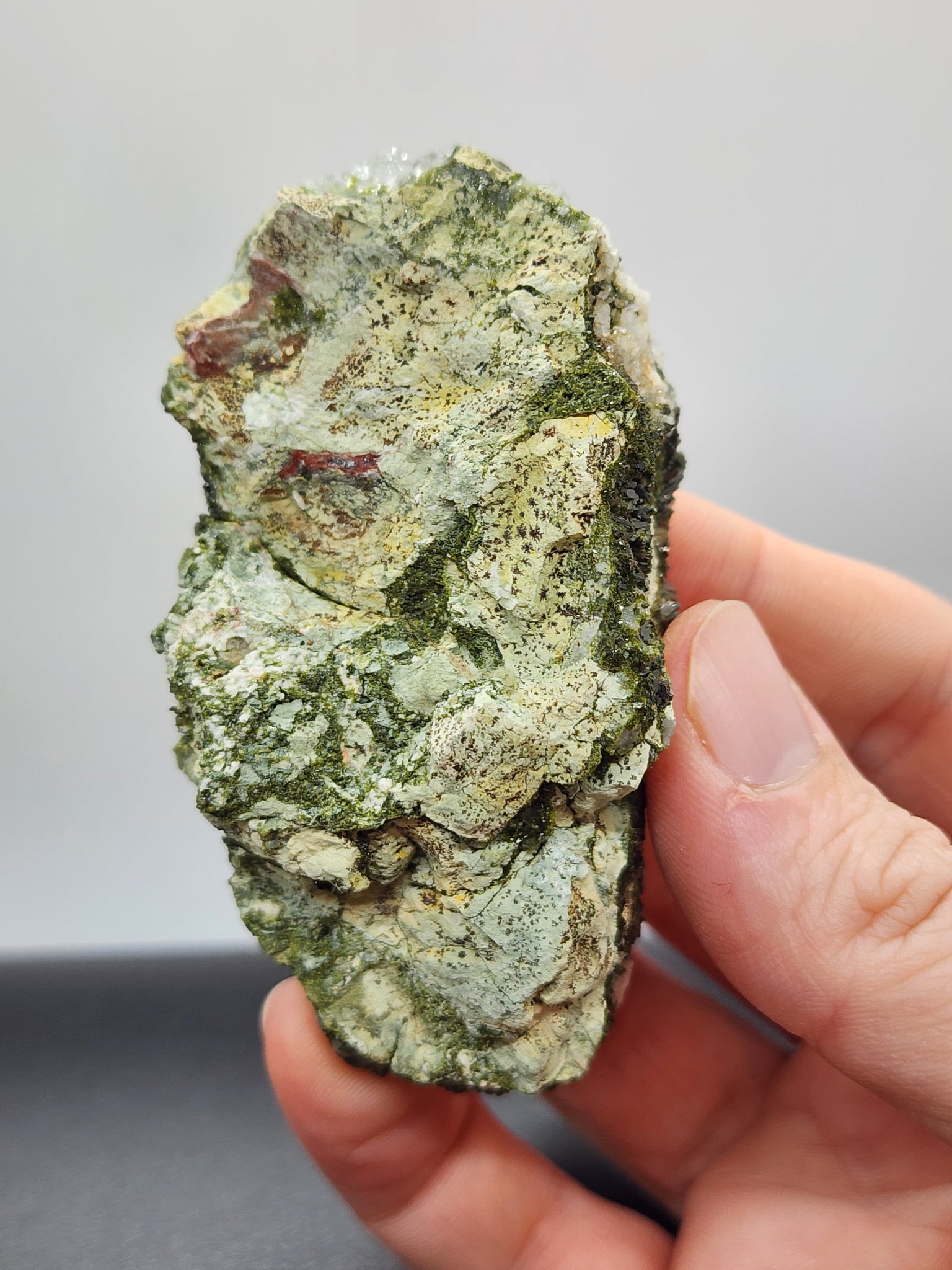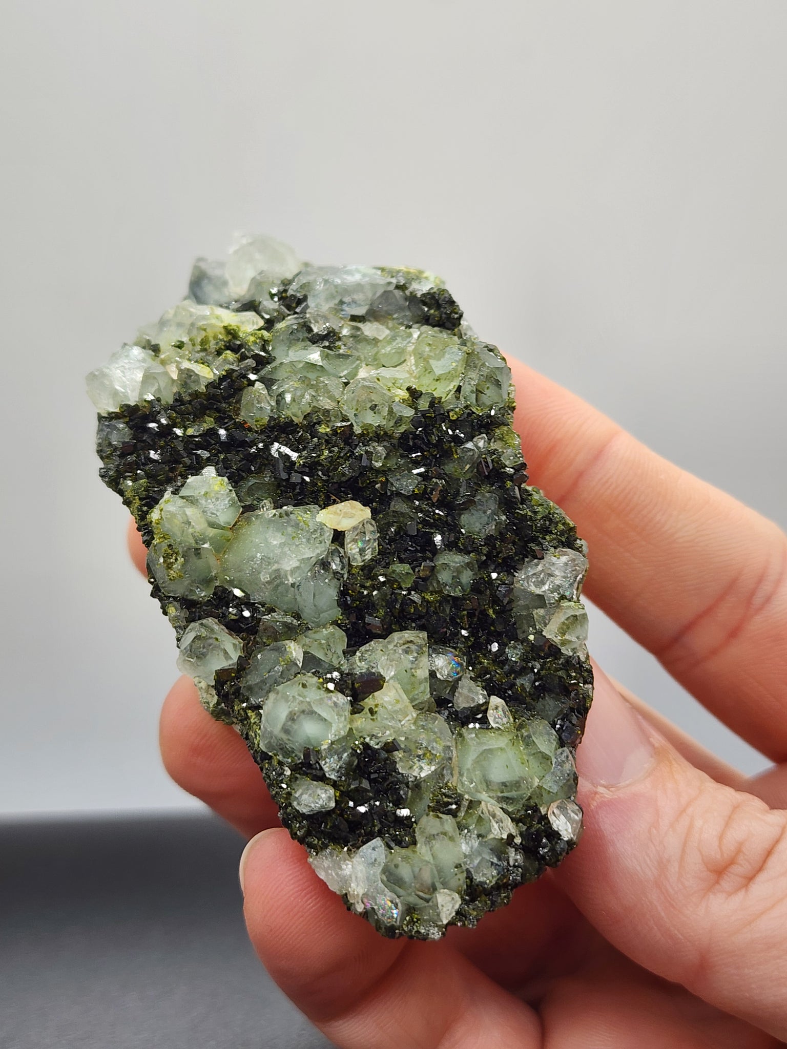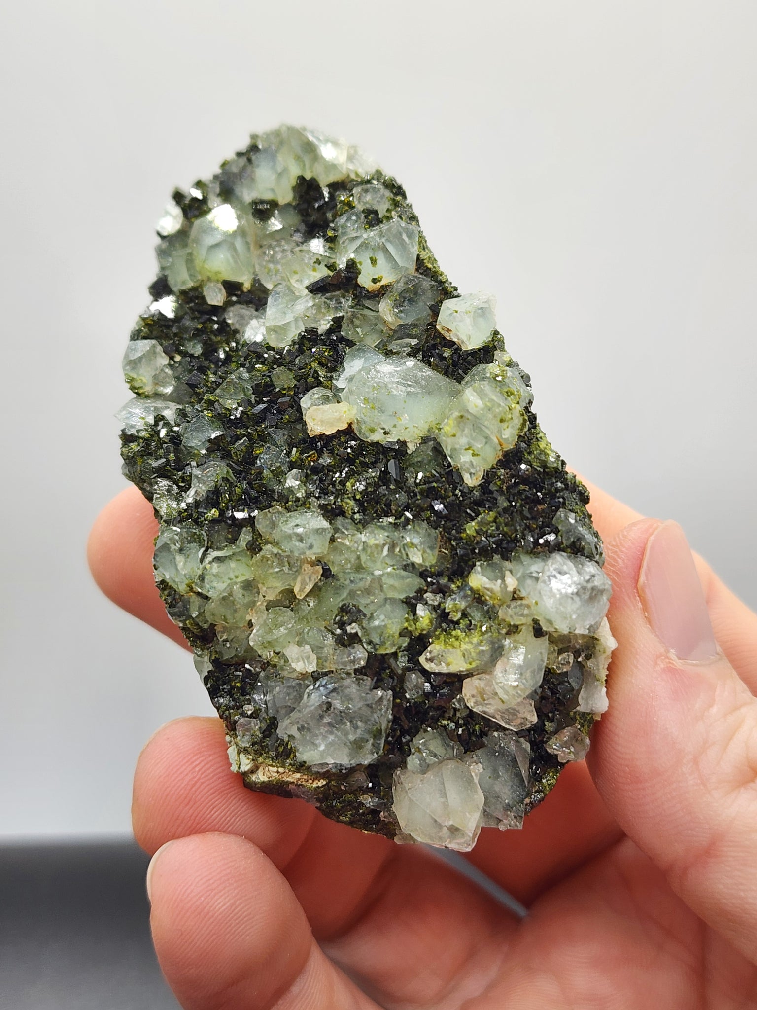 Quartz and Epidote from the Hakkari District in Turkey represent one of the world's most aesthetically stunning mineral combinations. These specimens are found specifically in the Hakkâri Province of southeastern Turkey, within the rugged and remote landscapes of the Emet Mountains near Uludoruk, as well as areas around Şemdinli and Yüksekova . The geological conditions here have produced magnificent clusters of clear to smoky, glassy quartz crystals that are often fully or partially covered by a druse of tiny, sparkling dark green epidote crystals . What makes these specimens particularly special is the intense color contrast between the transparent quartz and the vibrant, pistachio-to-forest-green epidote, which sometimes forms in such dense concentrations that it resembles green moss growing on ice . Mined by hand at extreme elevations reaching approximately 17,000 feet up the mountainsides, these crystals are prized by collectors for their exceptional luster, the unusual skeletal formations sometimes present, and the way the small, faceted epidote crystals catch and reflect light when the specimen is rotated .