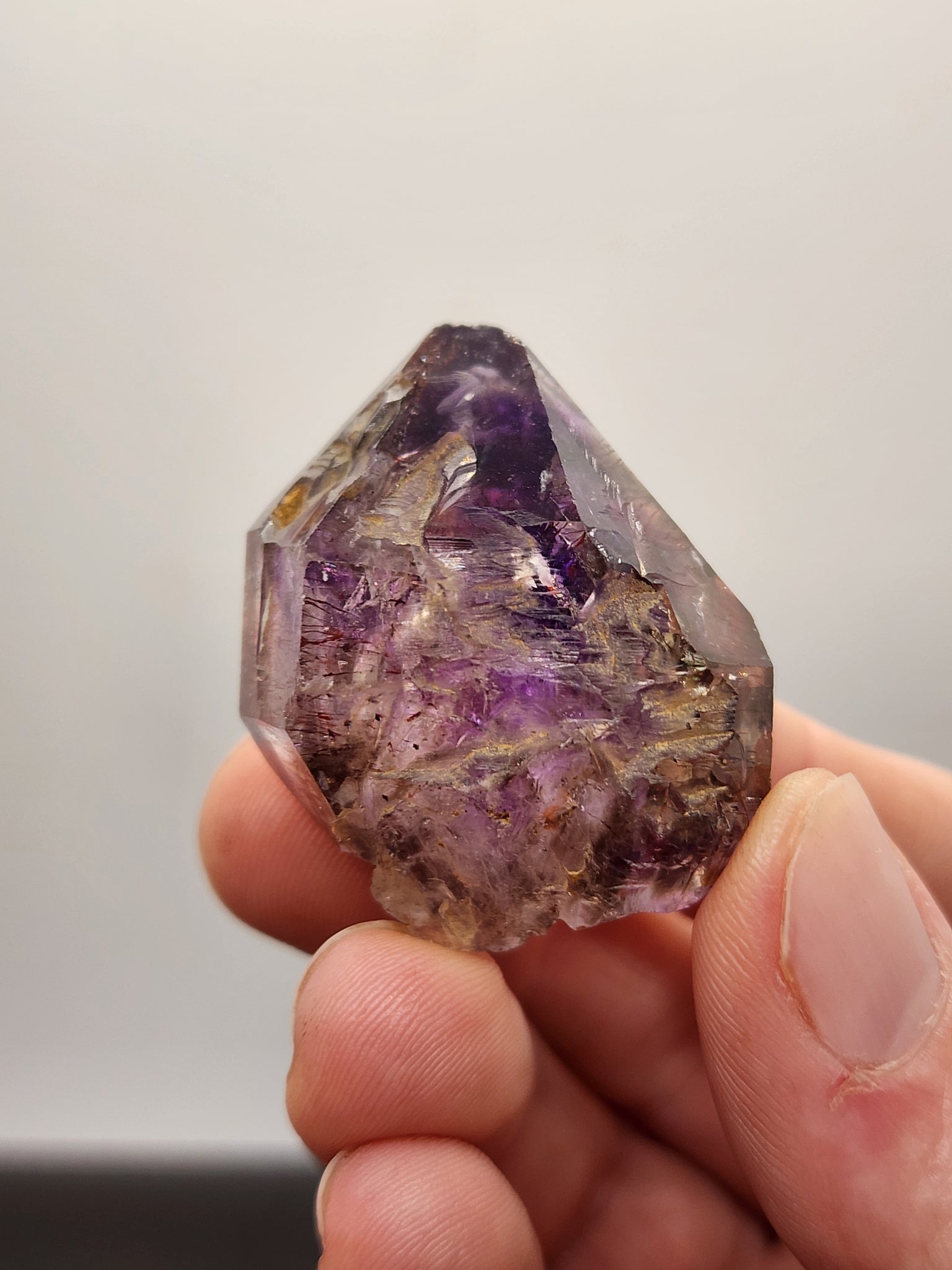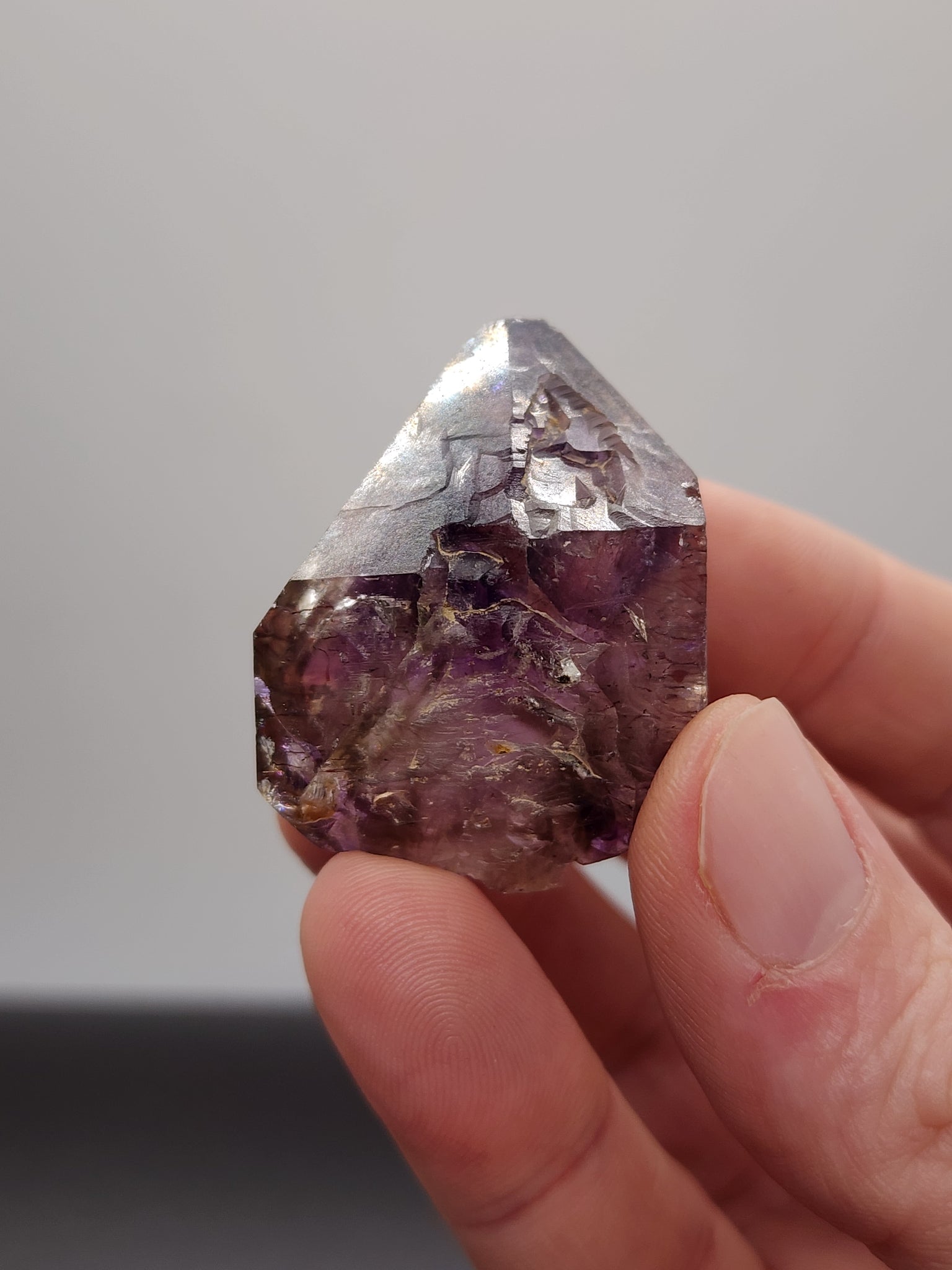 This exquisite specimen is a rare Shangaan Amethyst from the famed Chibuku Mine in Zimbabwe, named for the indigenous Shangaan people. It exhibits a classic geological formation where a distinct, larger "crown" of deep purple amethyst rests atop a slender, translucent quartz stem. The crystal's captivating beauty lies in its complex coloration, blending rich royal purple with smoky and clear zones, all enriched by tiny, sparkling red hematite inclusions that appear as delicate flakes throughout the stone. This completely natural, museum-quality piece also showcases intricate growth features such as phantoms and skeletal layers, making it a fascinating landscape within a single crystal for the discerning collector.