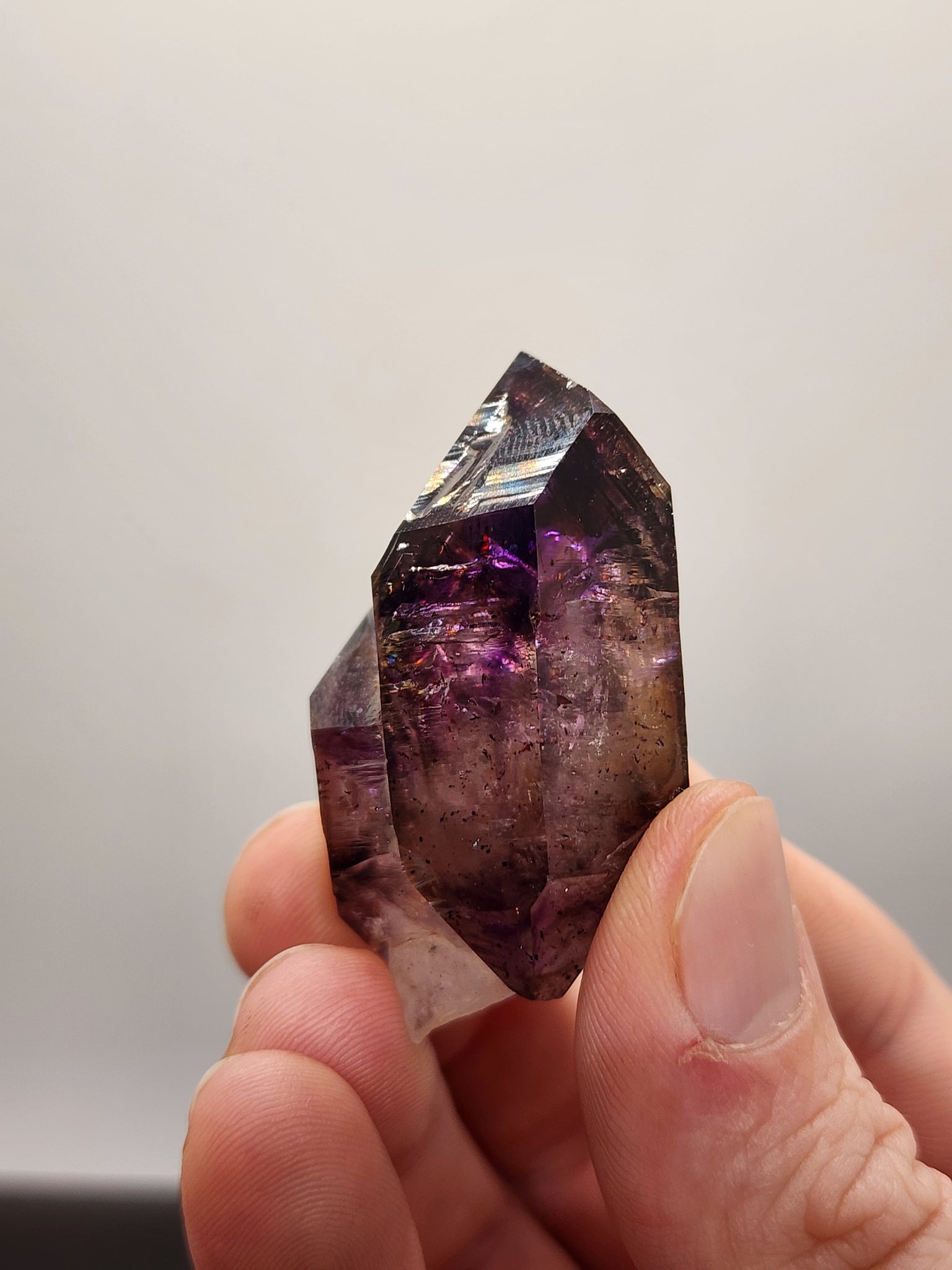 This exquisite specimen is a rare Shangaan Amethyst Scepter from the famed Chibuku Mine in Zimbabwe, named for the indigenous Shangaan people. It exhibits a classic geological formation where a distinct, larger "crown" of deep purple amethyst rests atop a slender, translucent quartz stem. The crystal's captivating beauty lies in its complex coloration, blending rich royal purple with smoky and clear zones, all enriched by tiny, sparkling red hematite inclusions that appear as delicate flakes throughout the stone. This completely natural, museum-quality piece also showcases intricate growth features such as phantoms and skeletal layers, making it a fascinating landscape within a single crystal for the discerning collector.